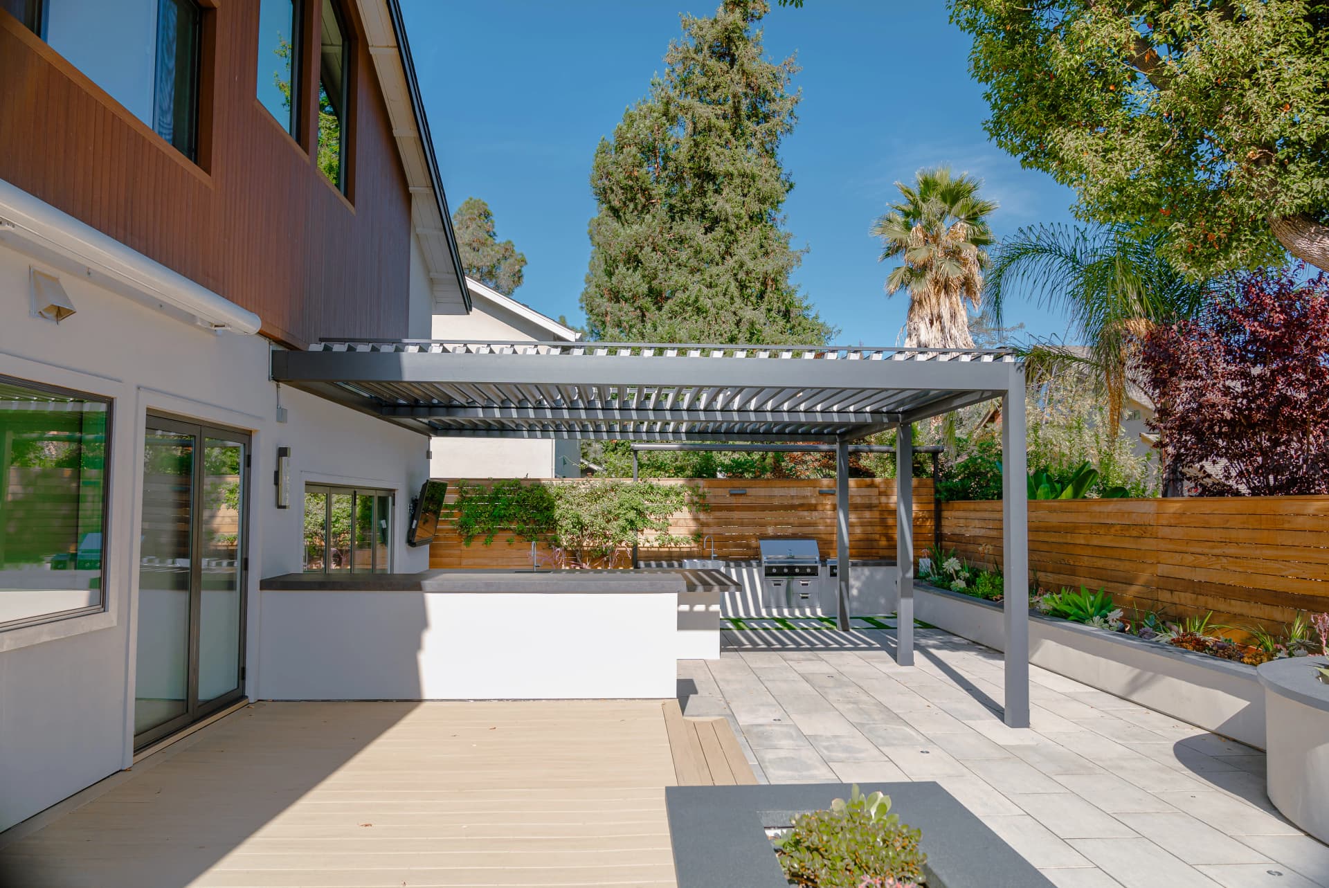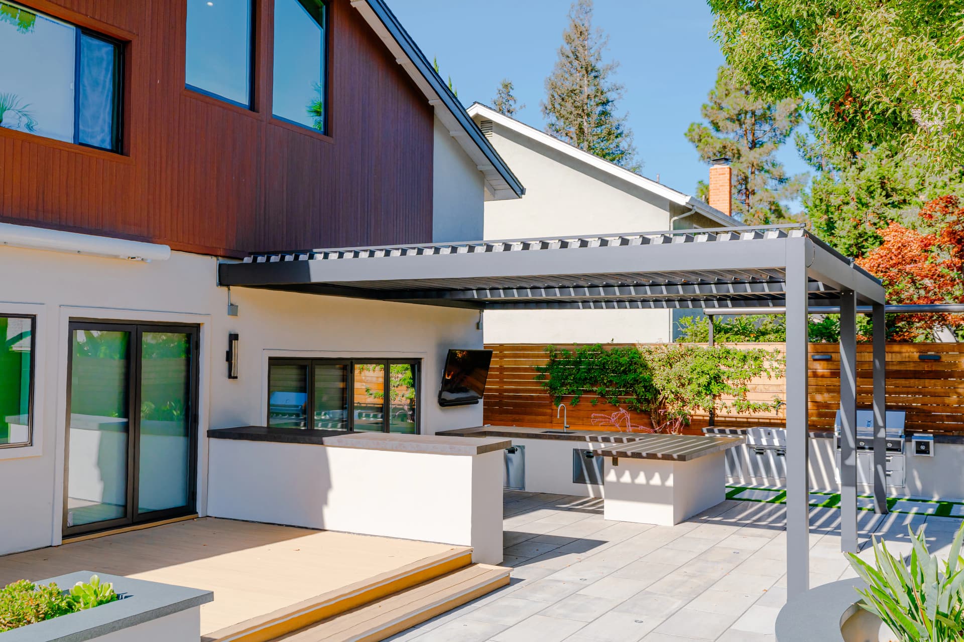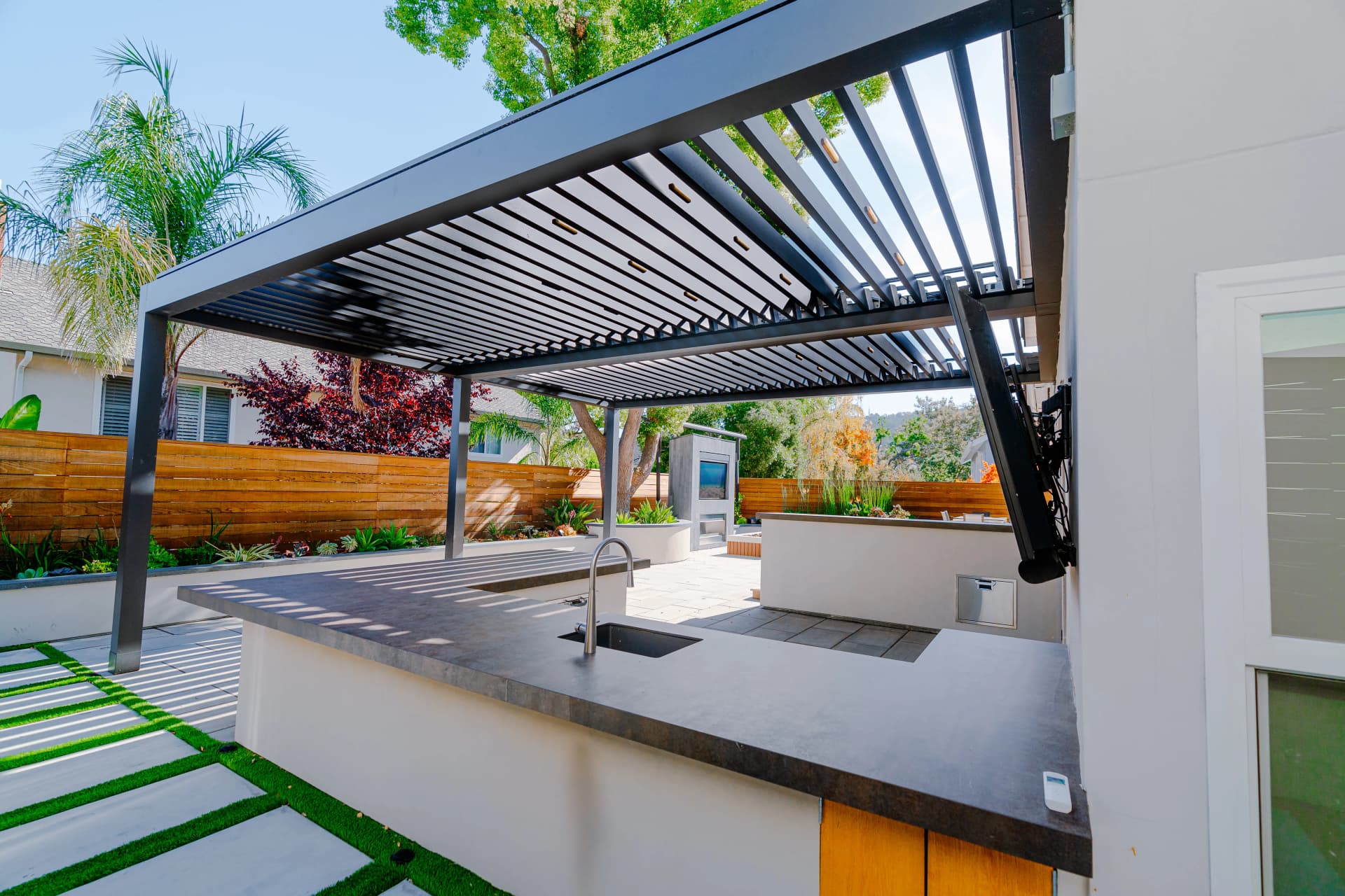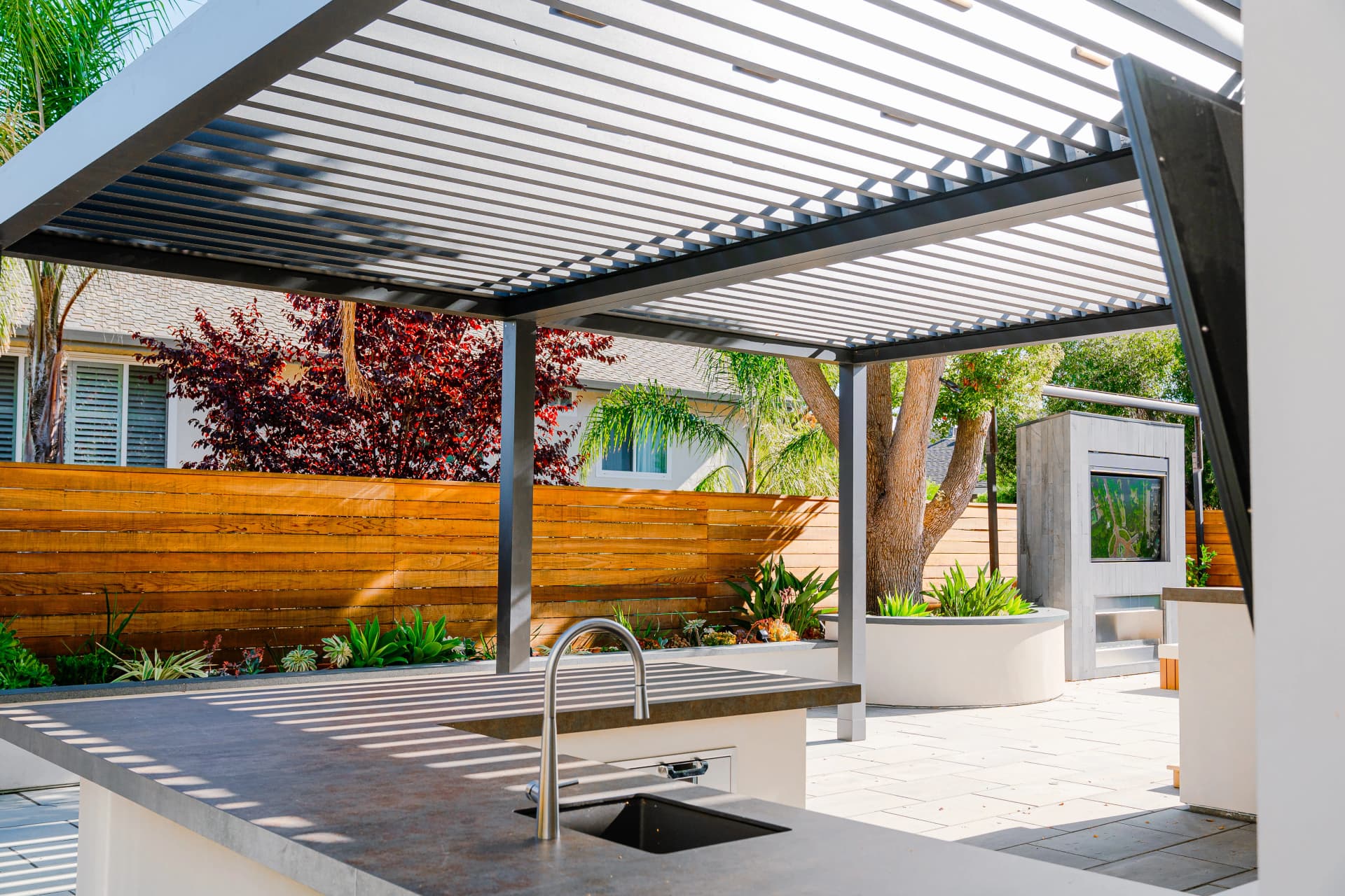 Alison, a South San Jose resident, enjoys spending her free time relaxing at home after a busy work schedule. Her backyard is designed as a peaceful retreat where she can unwind and enjoy the outdoor environment. To complement the beautiful landscape design of the property, we installed a SunTent OneLouver | Tiltable pergola above the outdoor kitchen area. The system features two louver sections with individual control, allowing Alison to adjust shade and ventilation independently. The pergola is attached to the home’s existing wall, creating a seamless architectural extension of the house. Our system blends perfectly with the backyard’s elegant landscape design, completing the outdoor space with both beauty and functionality.