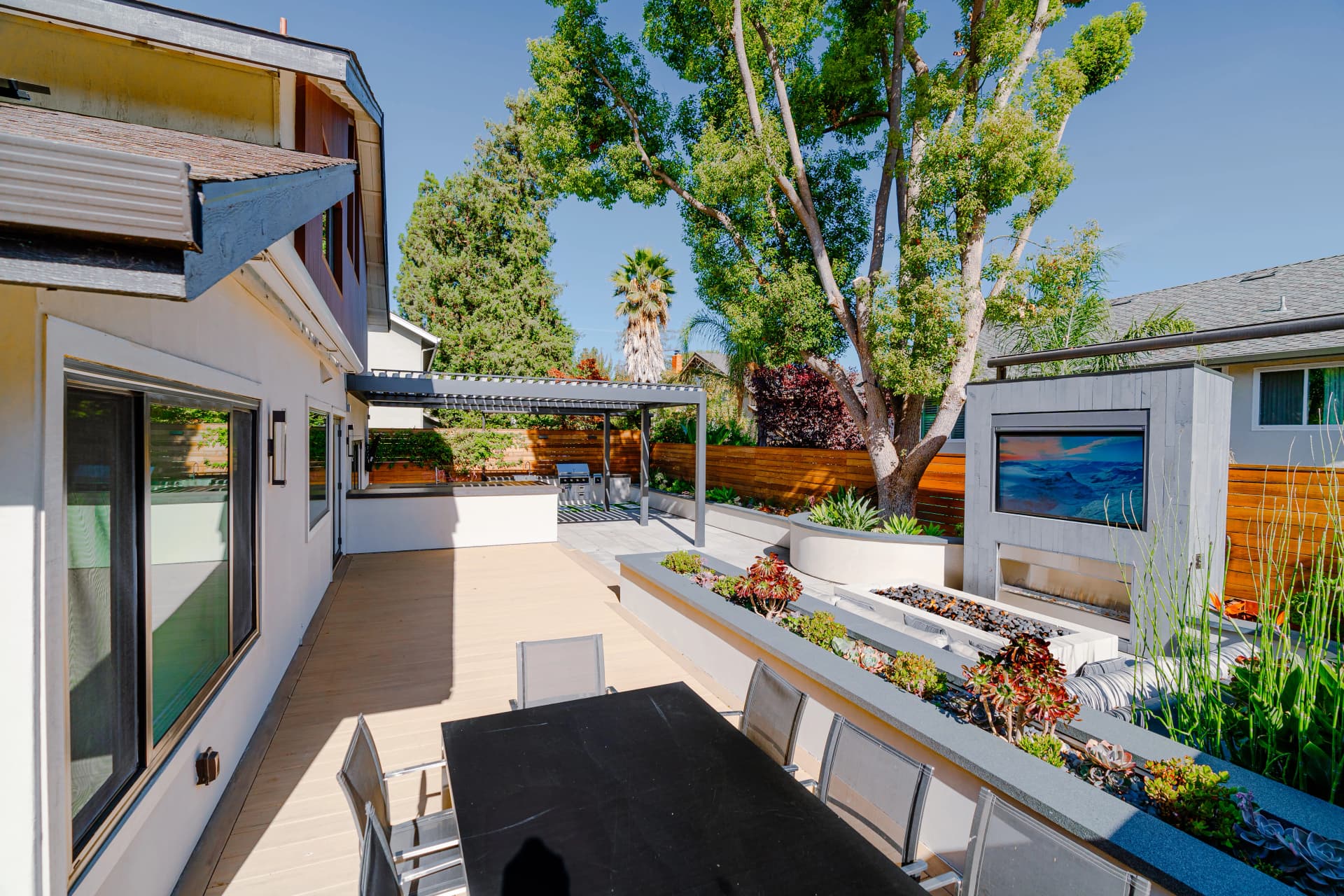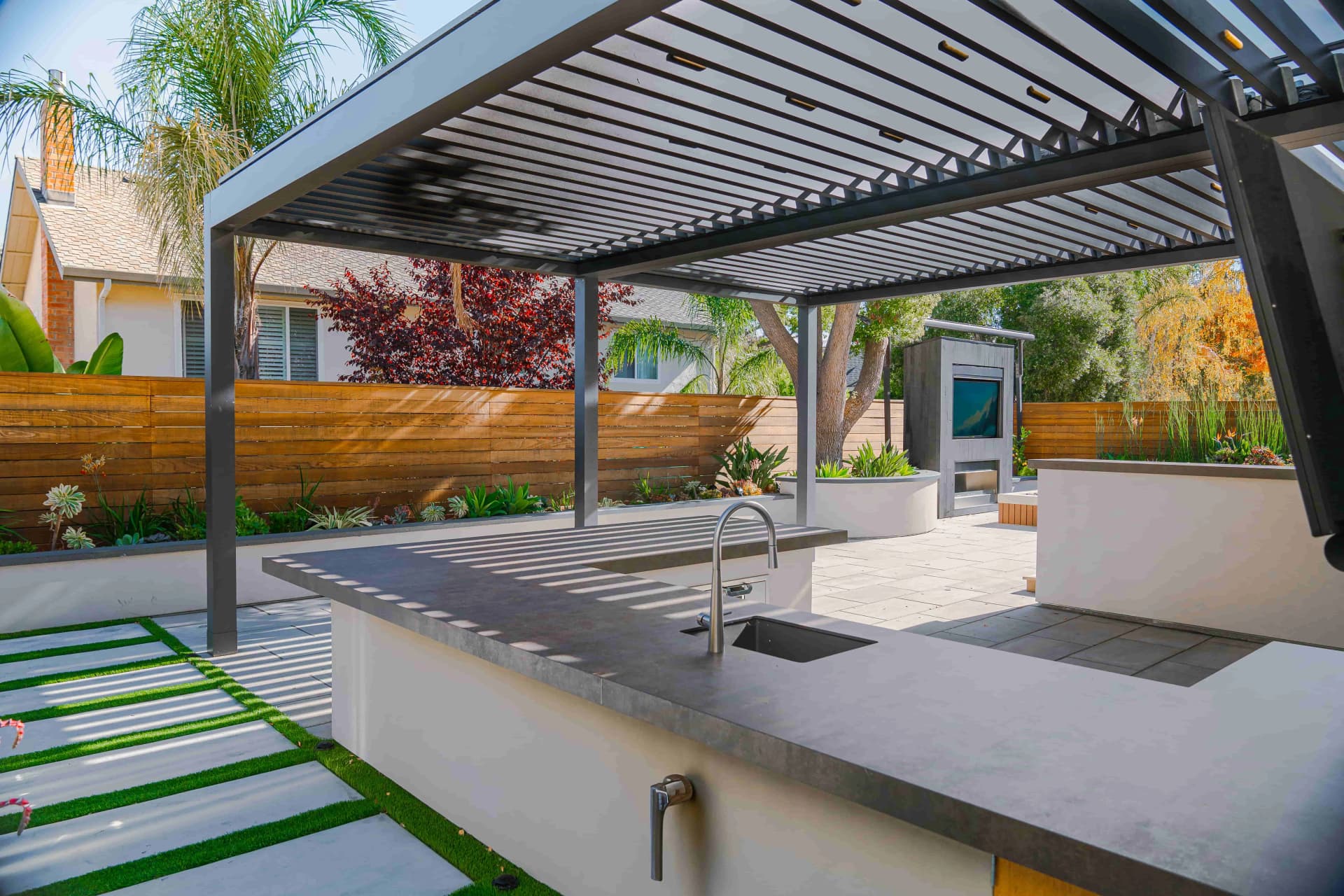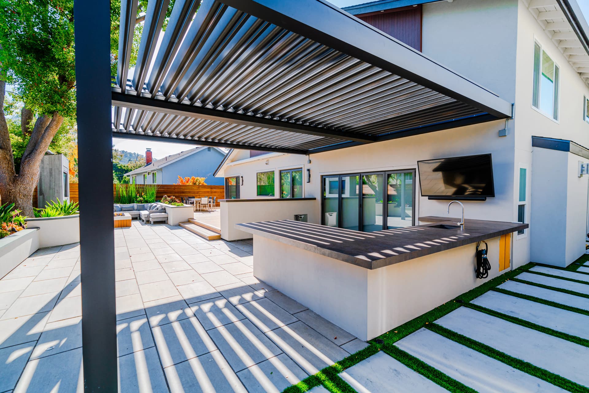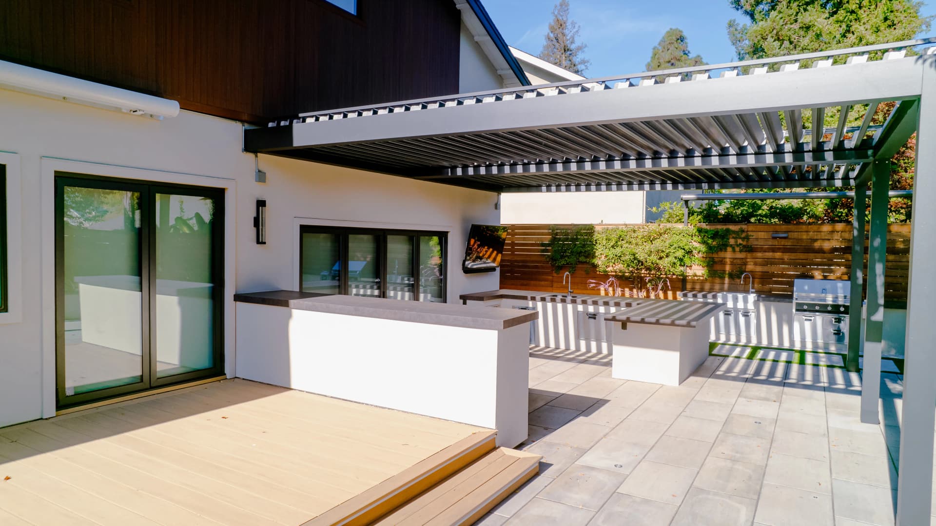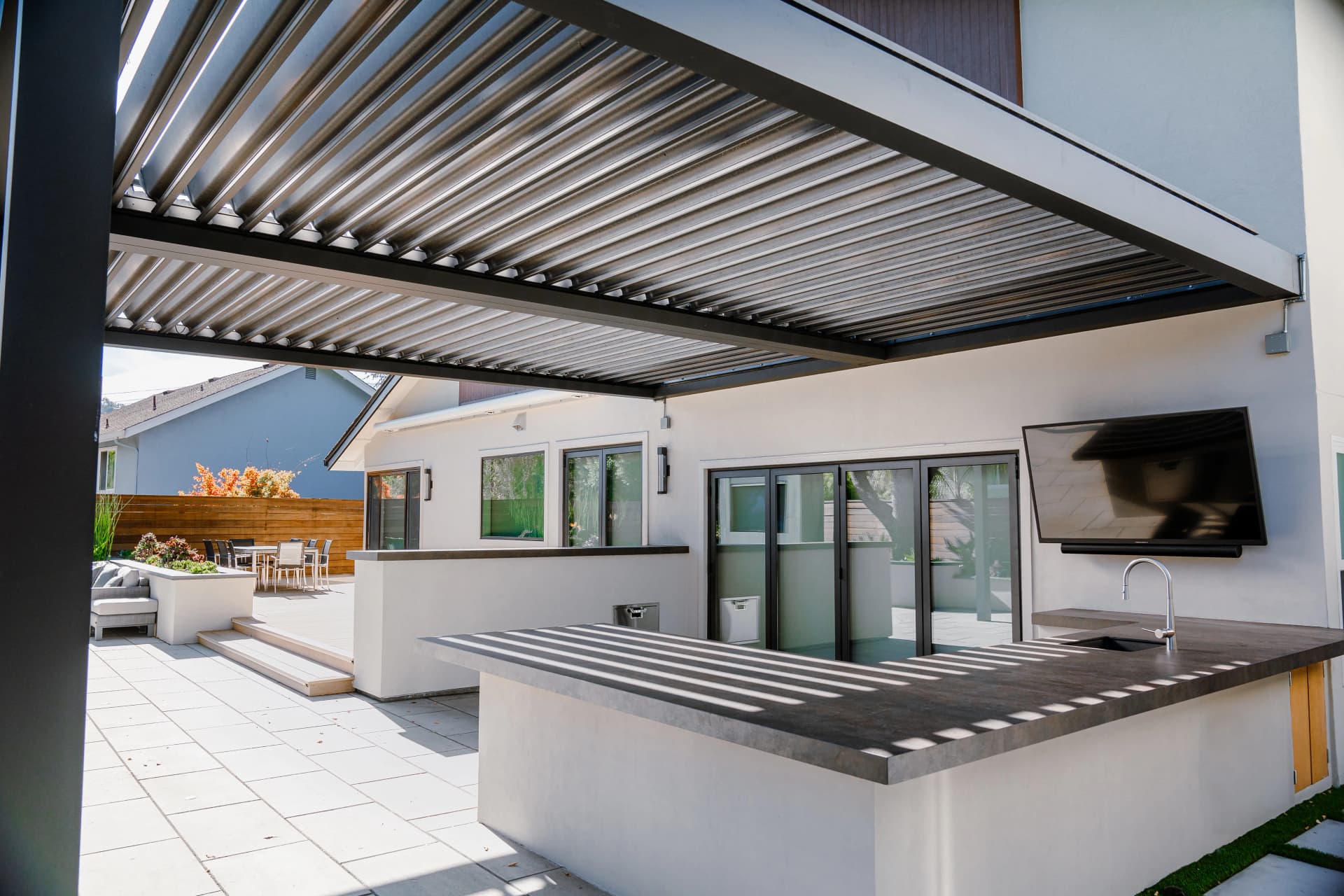 Alison, a South San Jose resident, enjoys spending her free time relaxing at home after a busy work schedule. Her backyard is designed as a peaceful retreat where she can unwind and enjoy the outdoor environment. To complement the beautiful landscape design of the property, we installed a SunTent OneLouver | Tiltable pergola above the outdoor kitchen area. The system features two louver sections with individual control, allowing Alison to adjust shade and ventilation independently. The pergola is attached to the home’s existing wall, creating a seamless architectural extension of the house. Our system blends perfectly with the backyard’s elegant landscape design, completing the outdoor space with both beauty and functionality.