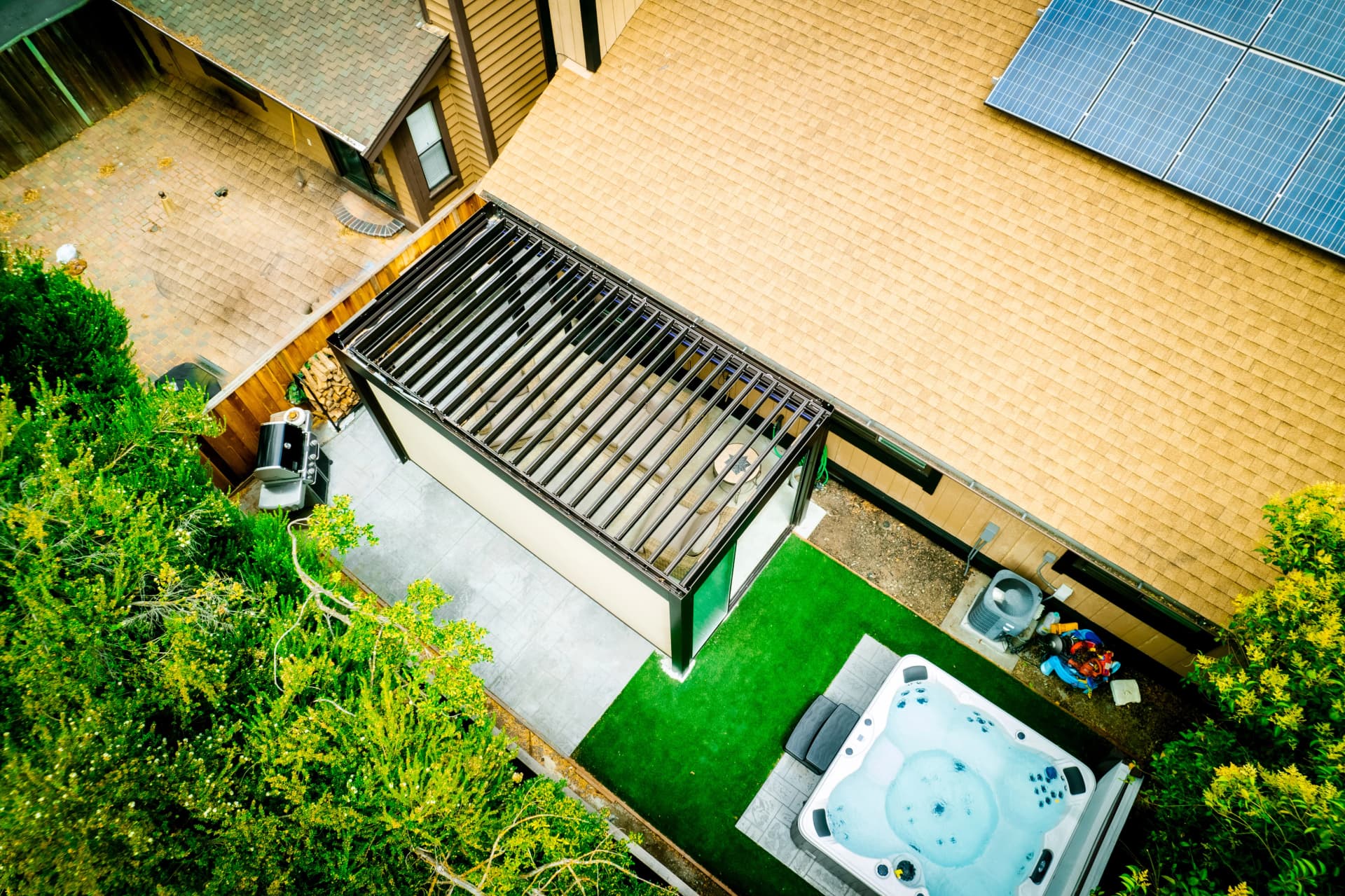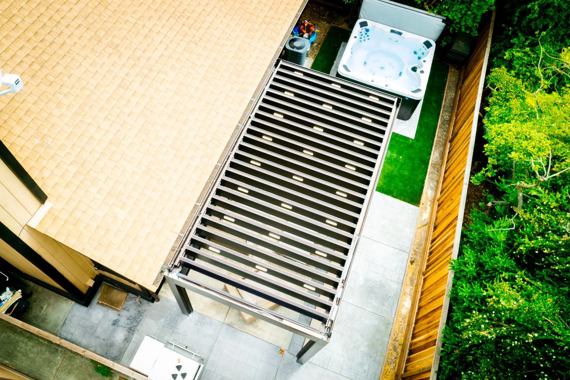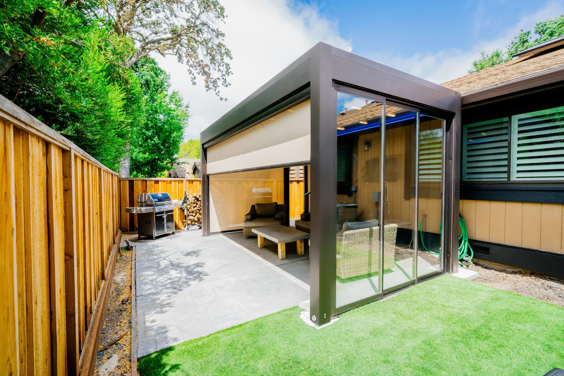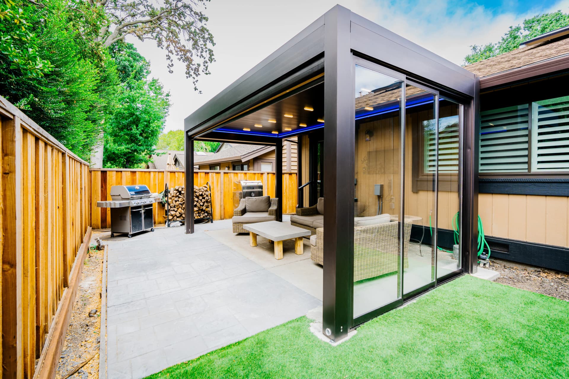 Steve installed a jacuzzi in the backyard of his San Francisco home, but he couldn’t comfortably use it due to direct sun exposure and changing weather conditions. To solve this issue, we installed a SunTent OneLouver | Tiltable pergola that provides adjustable shade and protection. The front side of the structure features a motorized zip screen to block strong sunlight when needed. On the sides, sliding glass doors protect the space from wind and dust while maintaining clear backyard views. The structure’s distinctive color tone adds a modern architectural touch to the backyard. Integrated RGB lighting creates a relaxing and visually impressive evening atmosphere around the jacuzzi.