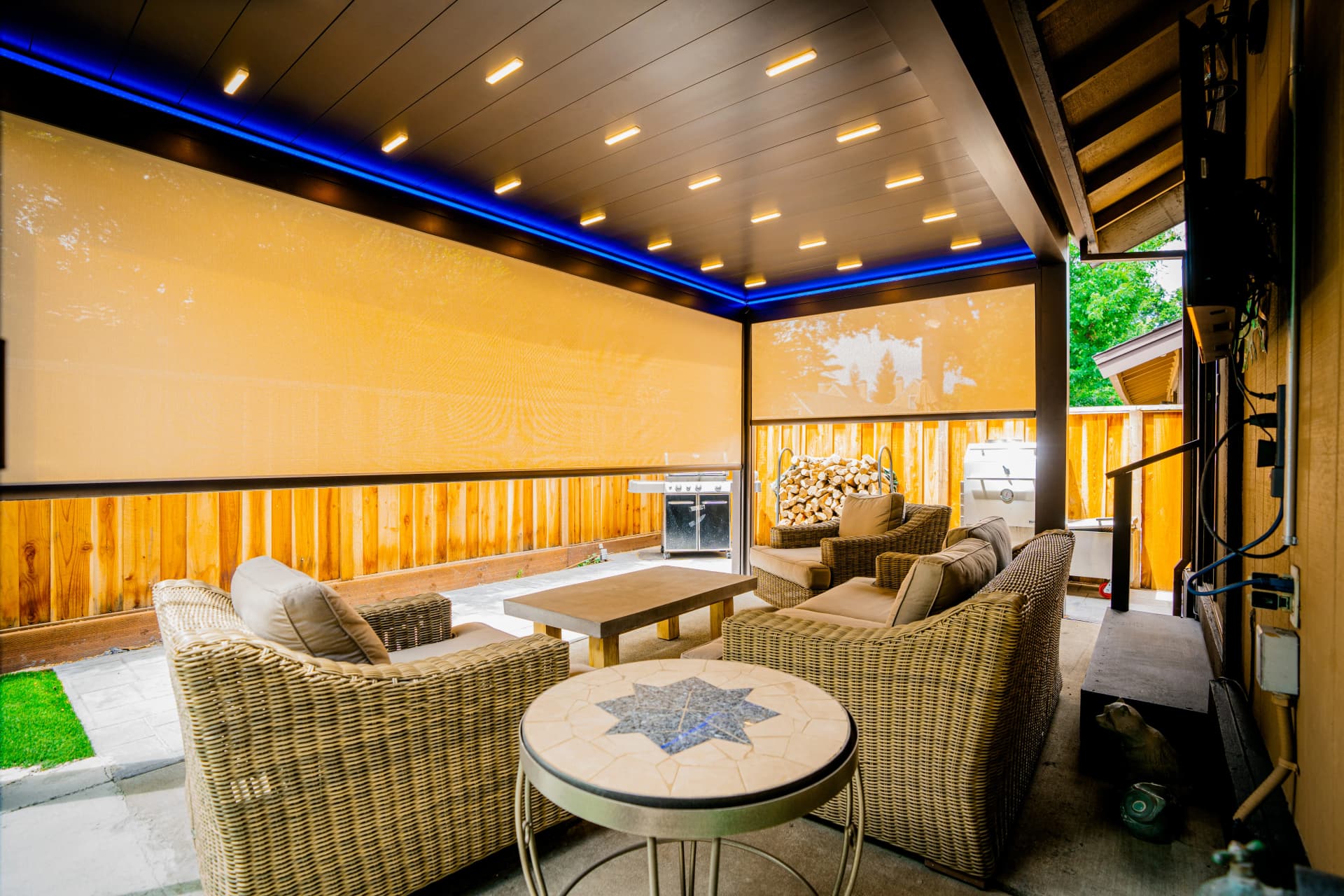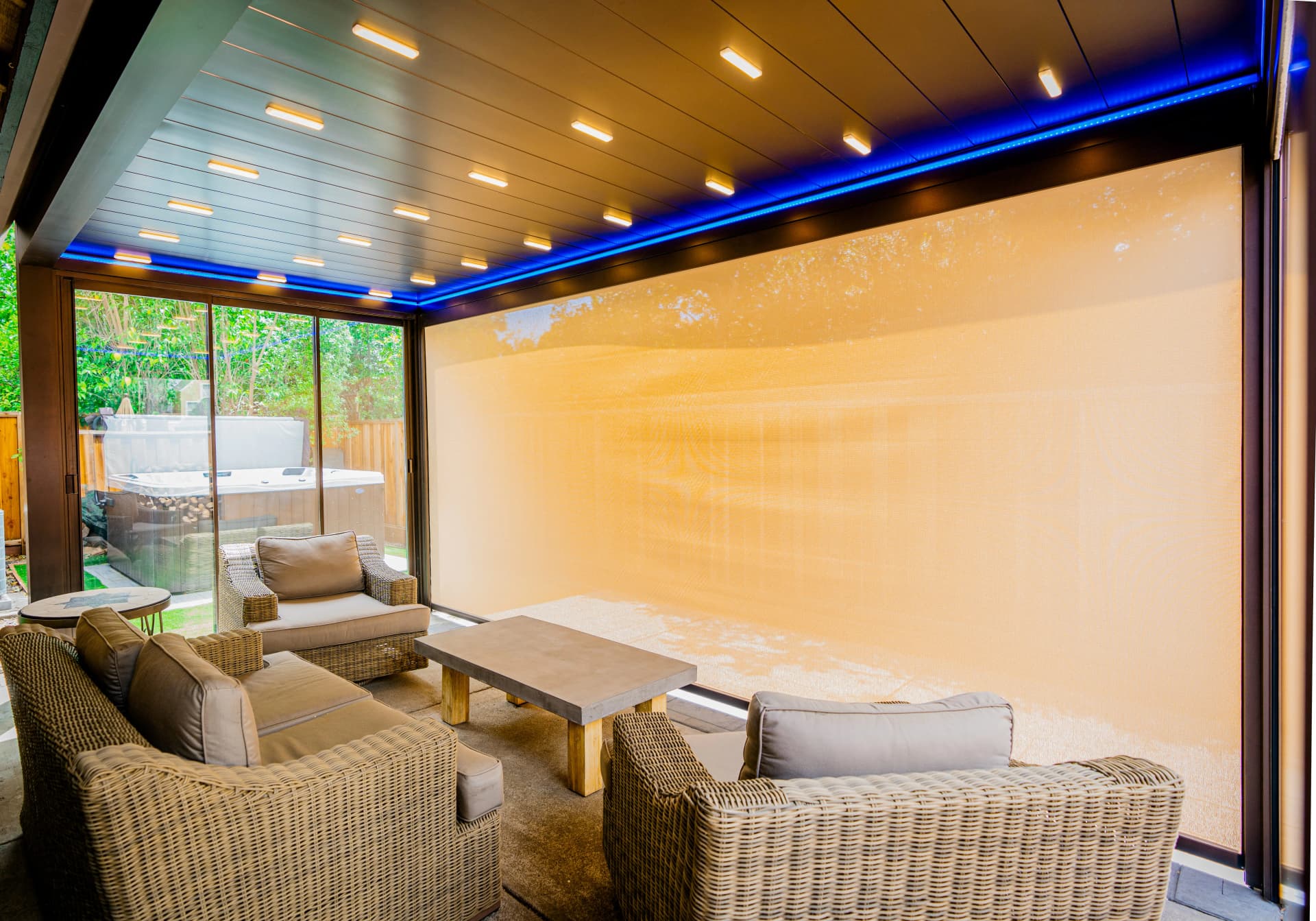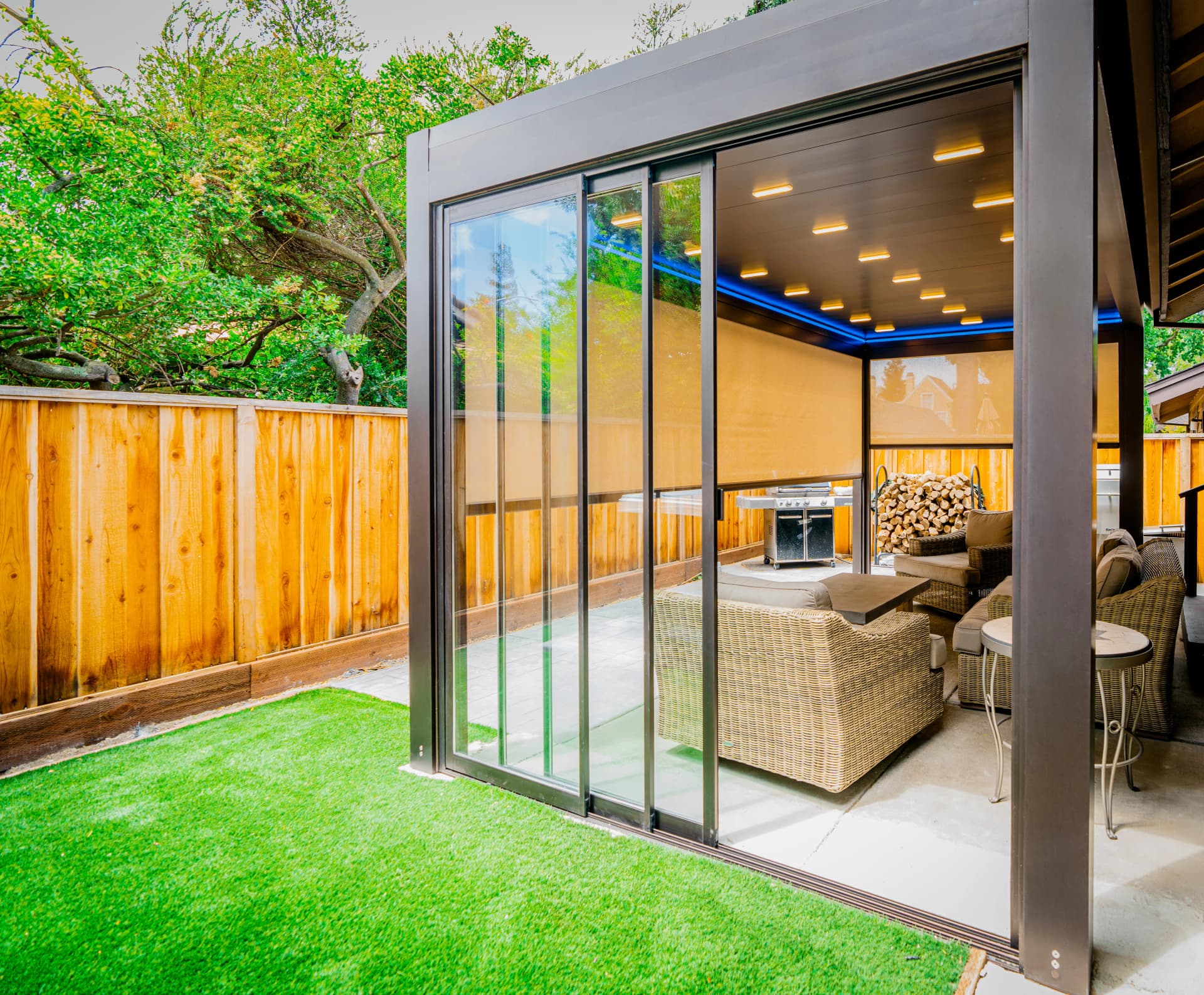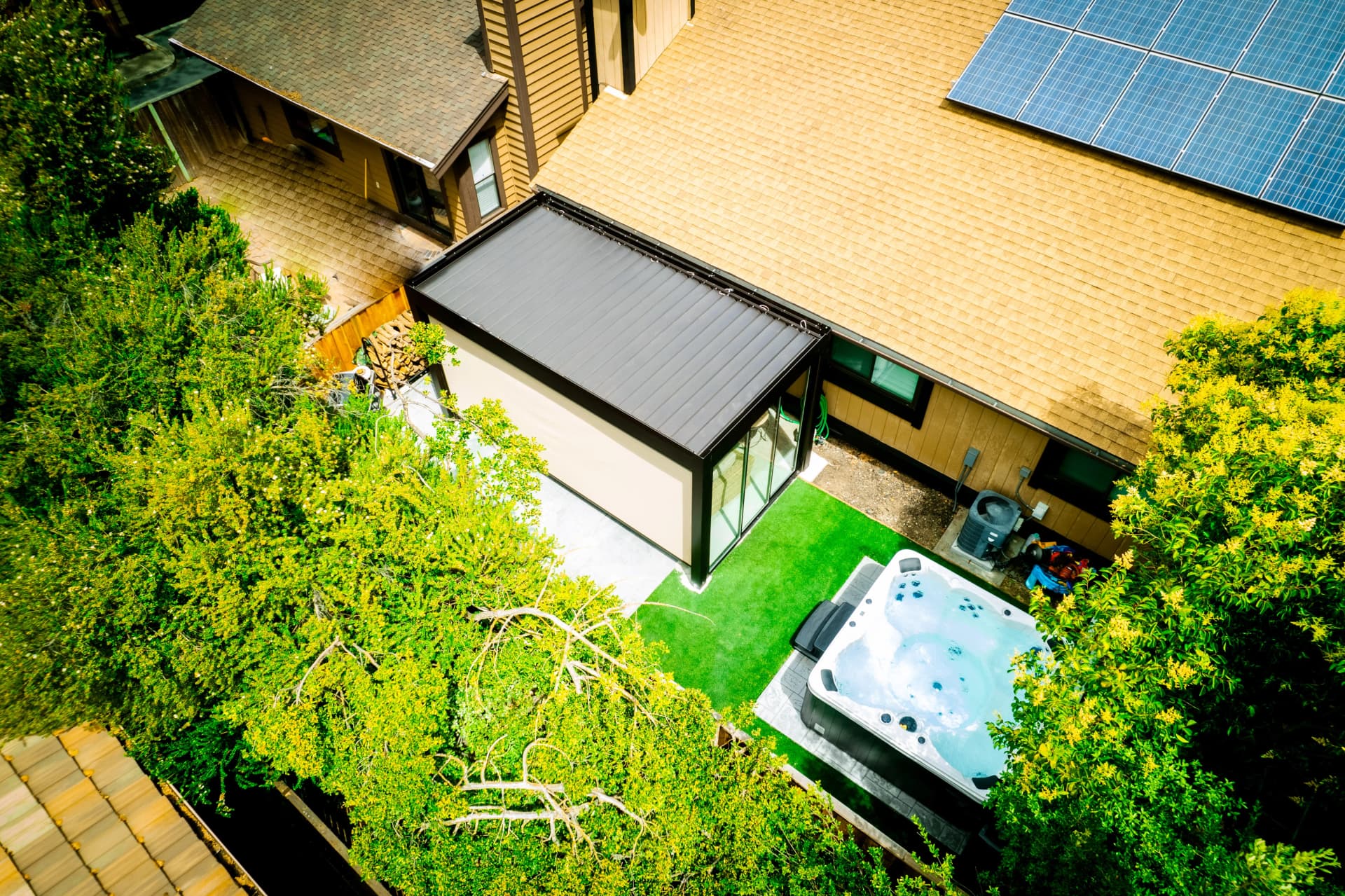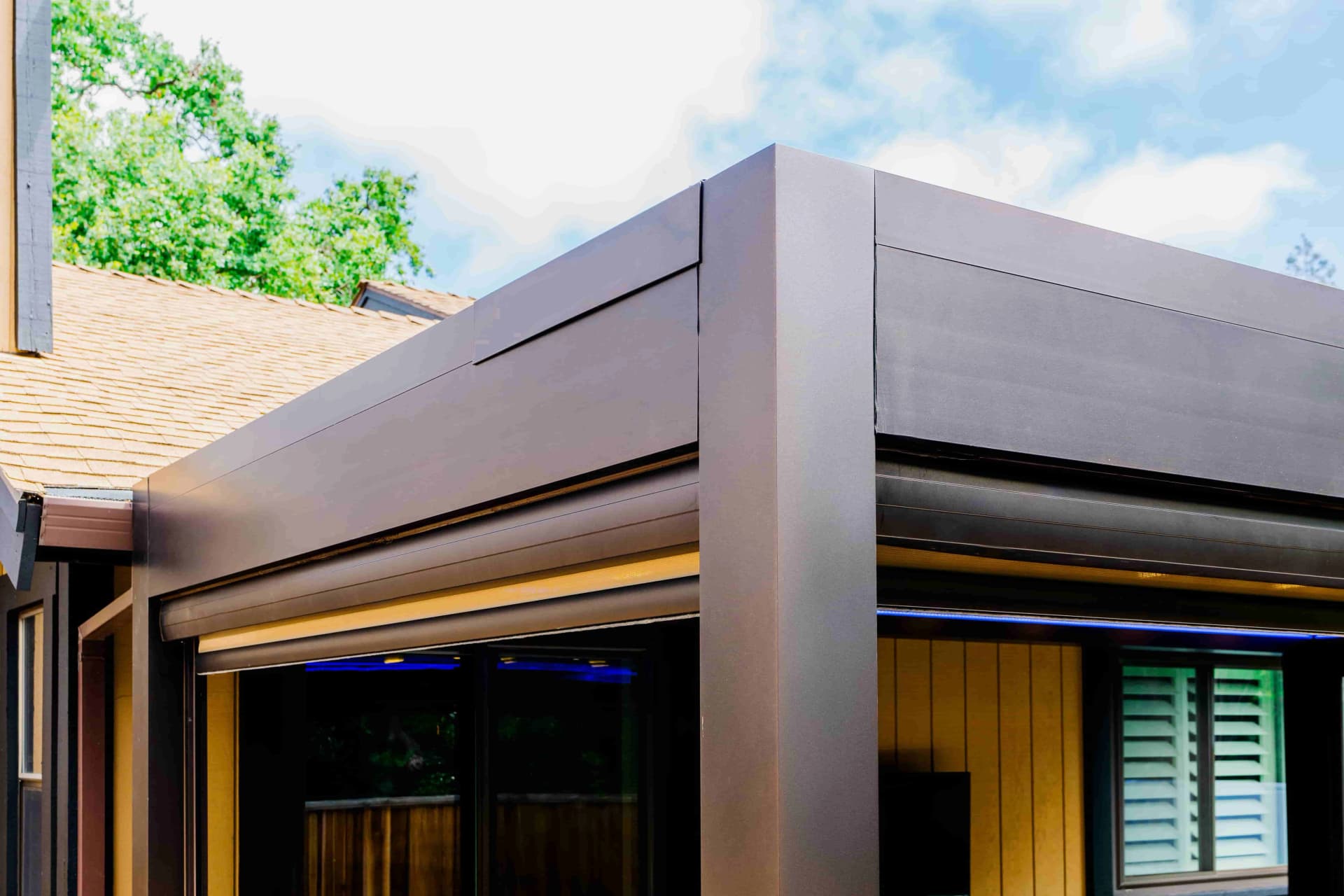 Steve installed a jacuzzi in the backyard of his San Francisco home, but he couldn’t comfortably use it due to direct sun exposure and changing weather conditions. To solve this issue, we installed a SunTent OneLouver | Tiltable pergola that provides adjustable shade and protection. The front side of the structure features a motorized zip screen to block strong sunlight when needed. On the sides, sliding glass doors protect the space from wind and dust while maintaining clear backyard views. The structure’s distinctive color tone adds a modern architectural touch to the backyard. Integrated RGB lighting creates a relaxing and visually impressive evening atmosphere around the jacuzzi.