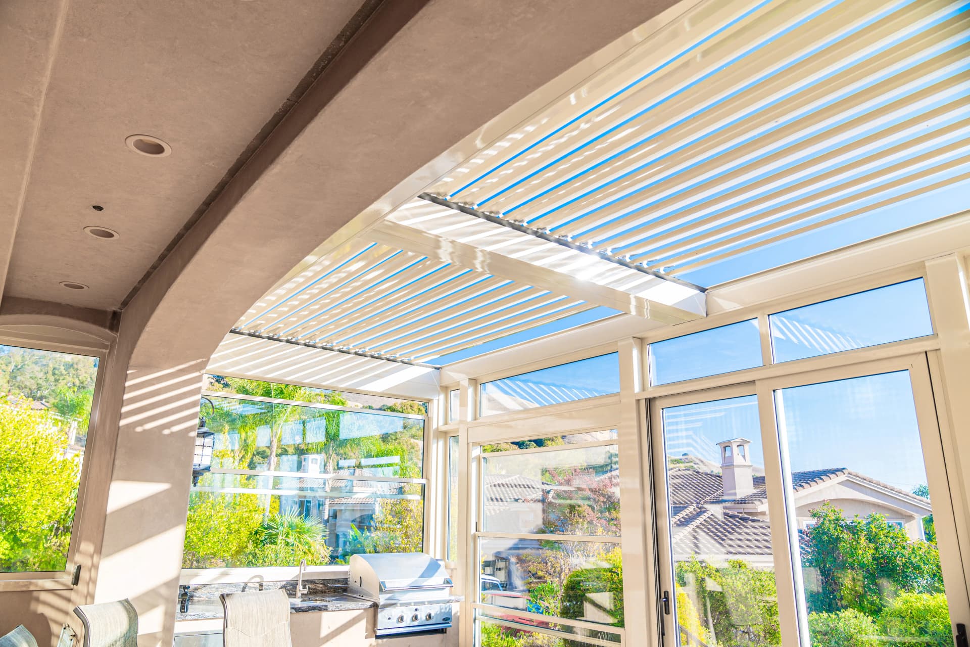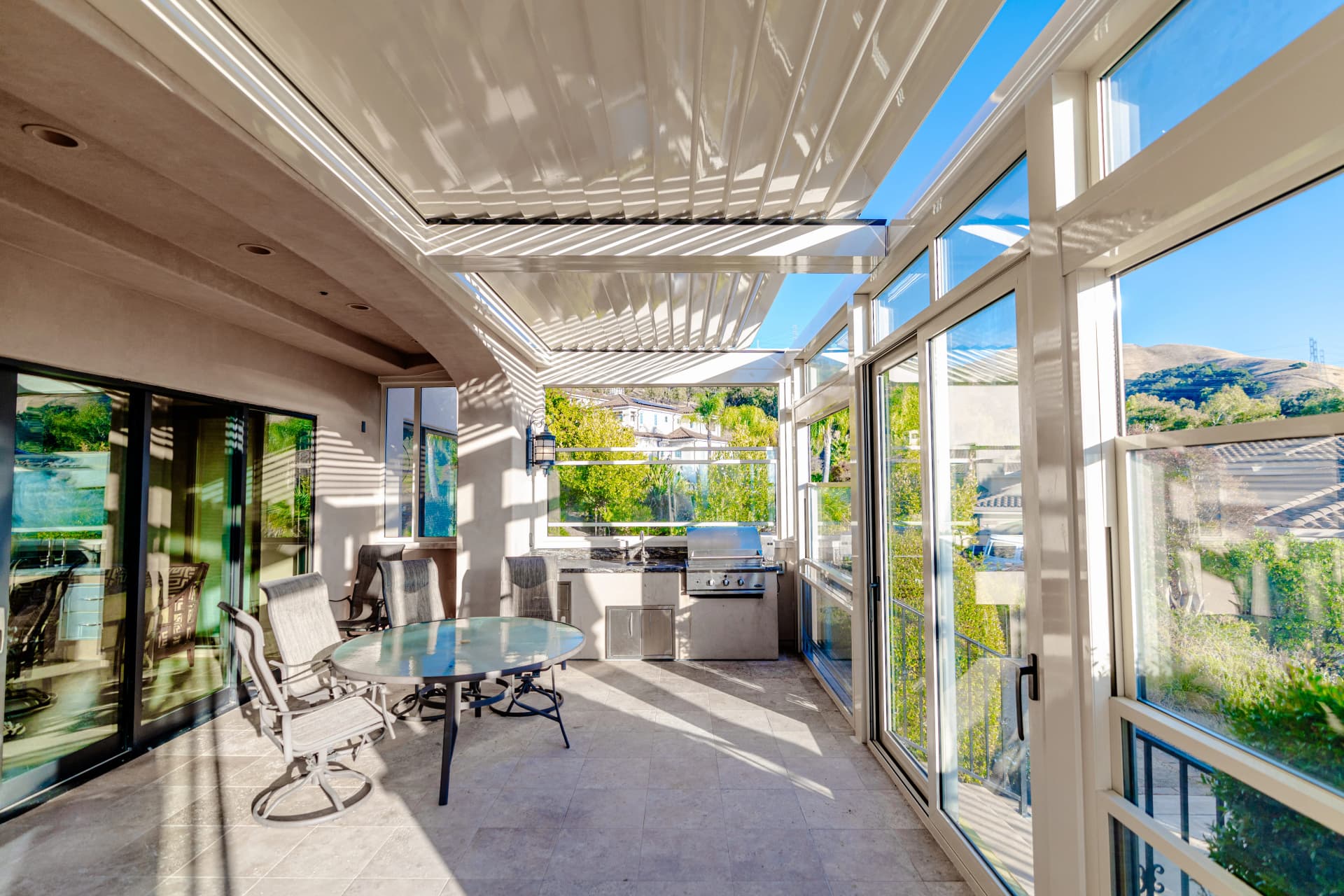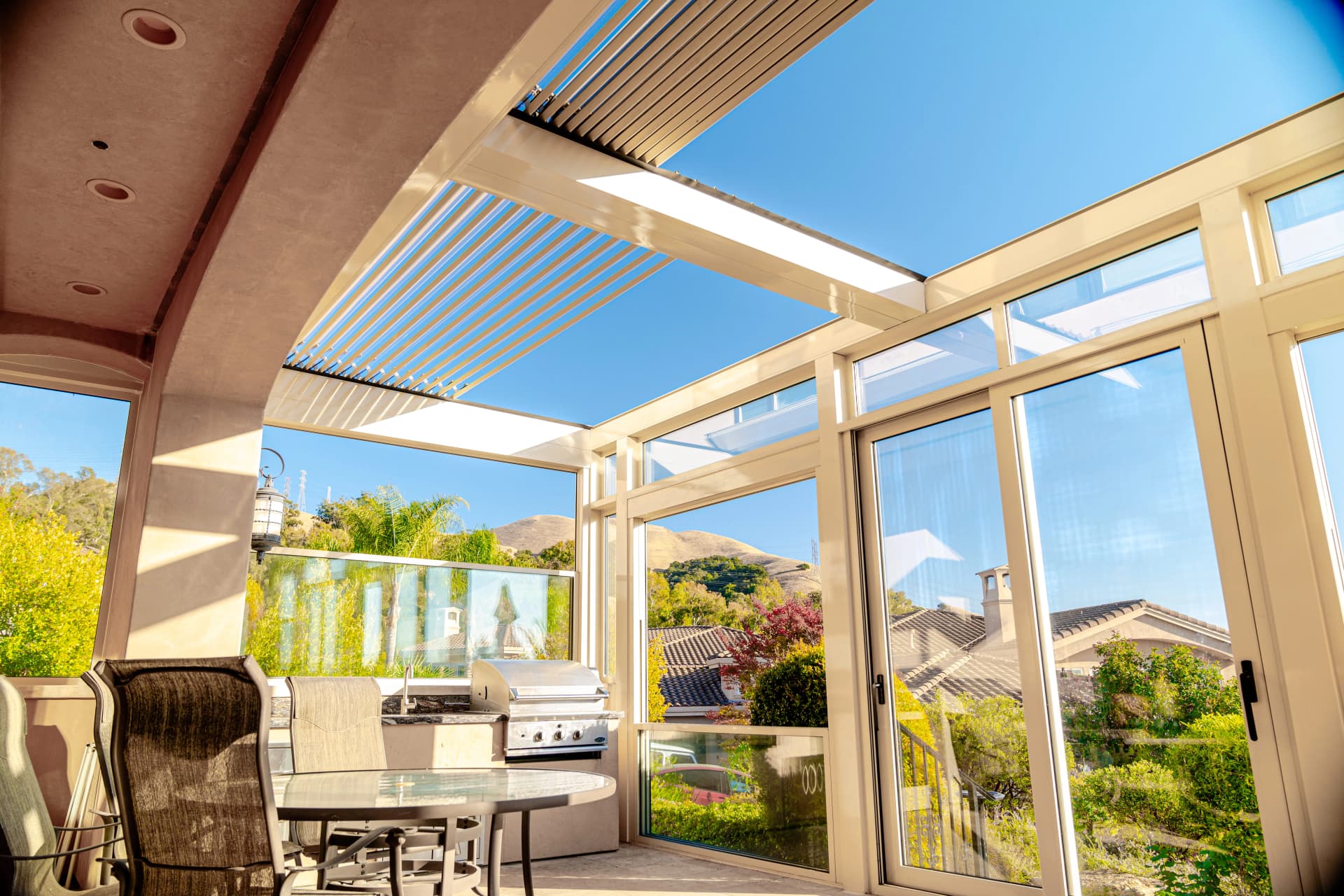 In this Fremont project, multiple SunTent systems were integrated across different areas of the home to create a cohesive outdoor living experience. For the patio’s outdoor kitchen area, we installed the SunTent OneLouver | Retractable Series, providing flexible shade and open-sky functionality. The enclosure was enhanced with motorized guillotine windows on the sides and sliding glass doors at the entrance for seamless access and protection. On another section of the home, we installed a GlassRoof system to create a bright and elegant covered seating area. By combining different systems, we designed both a comfortable outdoor kitchen enclosure and a relaxing lounge space. This hybrid approach allowed the homeowner to enjoy the backyard in multiple ways while maintaining a refined architectural look and year-round comfort.